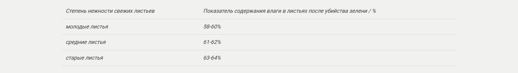 Зрелые листья содержат меньше влаги, а активность ферментов в них ниже, и они менее термостойки. При этом их структура более жёсткая.