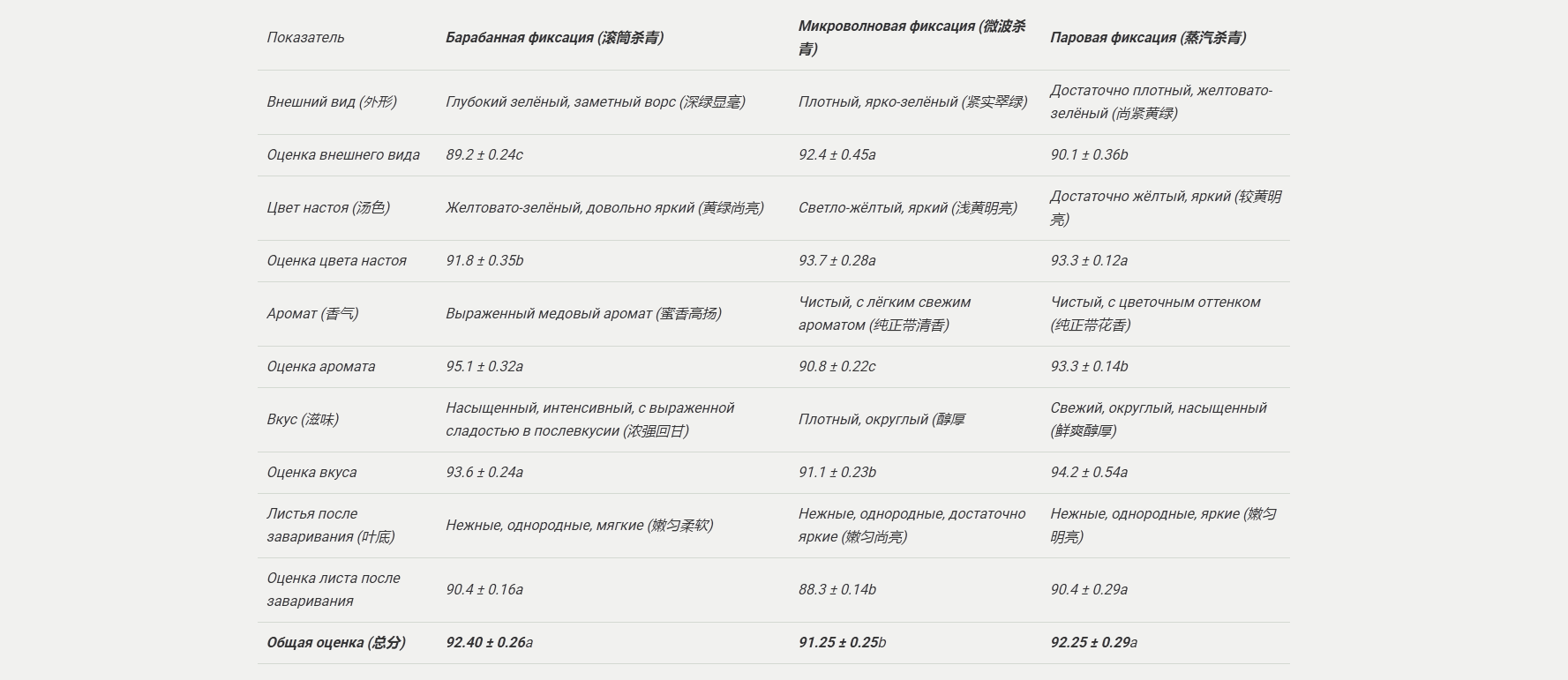 Что касается вкуса, то наивысший балл получила паровая обработка, продемонстрировавшая насыщенный, свежий и округлый вкус. Метод барабанной фиксации занял второе место, показав высокую интенсивность вкуса с выраженным послевкусием.