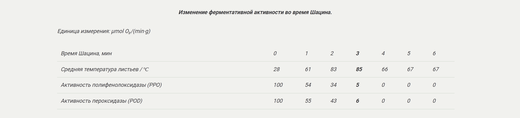 Так, полифенолоксидаза — главный фермент, катализирующий реакции окисления в чайном листе — проявляет наибольшую активность при 25–35 °C и разрушается при 75 °C. Второй важный фермент, пероксидаза, снижает активность при 35 °C, а при 45 °C, по сравнению с 35 °C, ее активность уменьшается почти на 27 %.