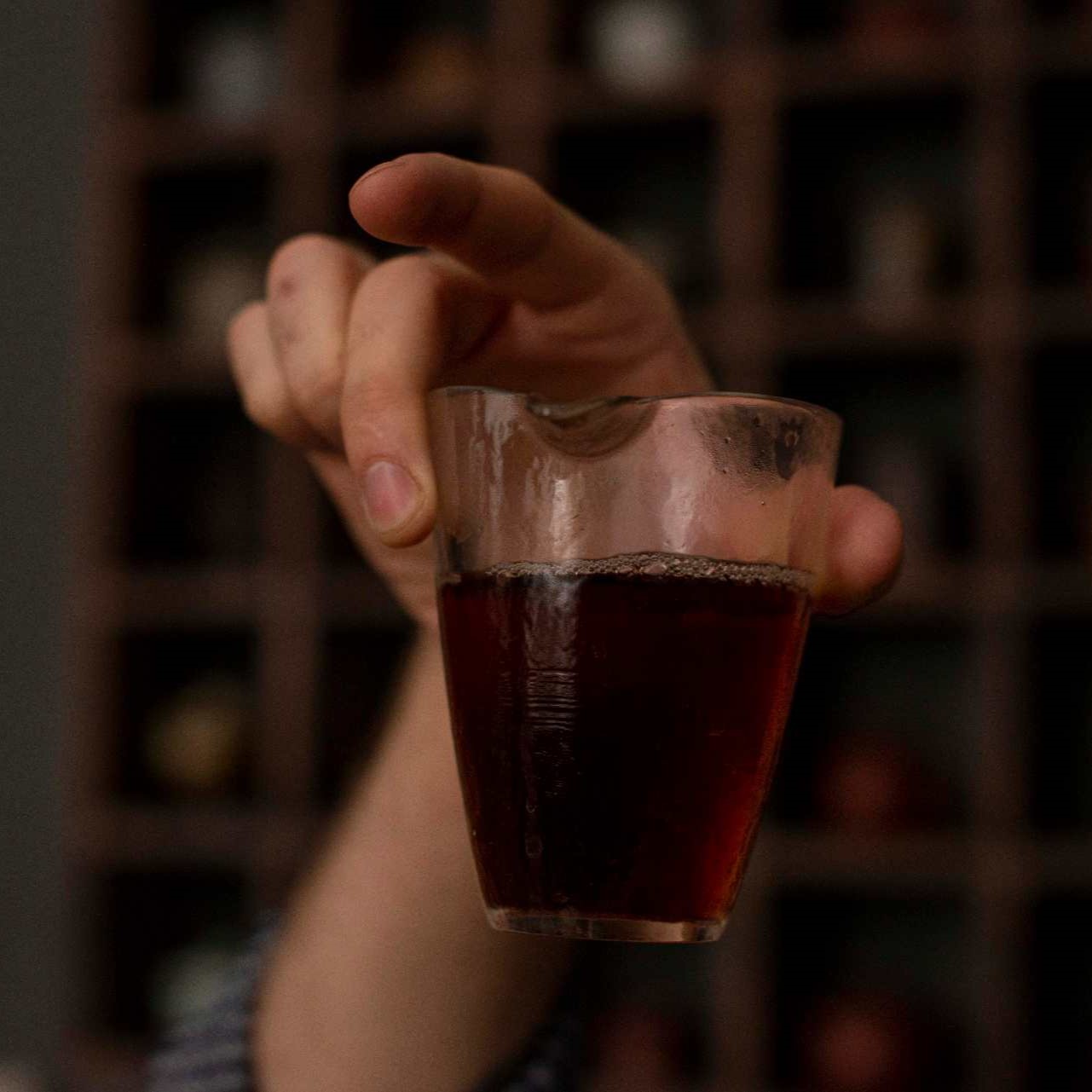 Настой цвета орехового дерева. Во вкусе — смолы и пряности, конфеты с ромом, парное молоко. Настой густой, сладкий, мягкий. С третьего пролива вкус соскальзывает в сторону свежести, настой становится более прозрачным, появляются отдаленные мотивы красного чая. Послевкусие короткое.