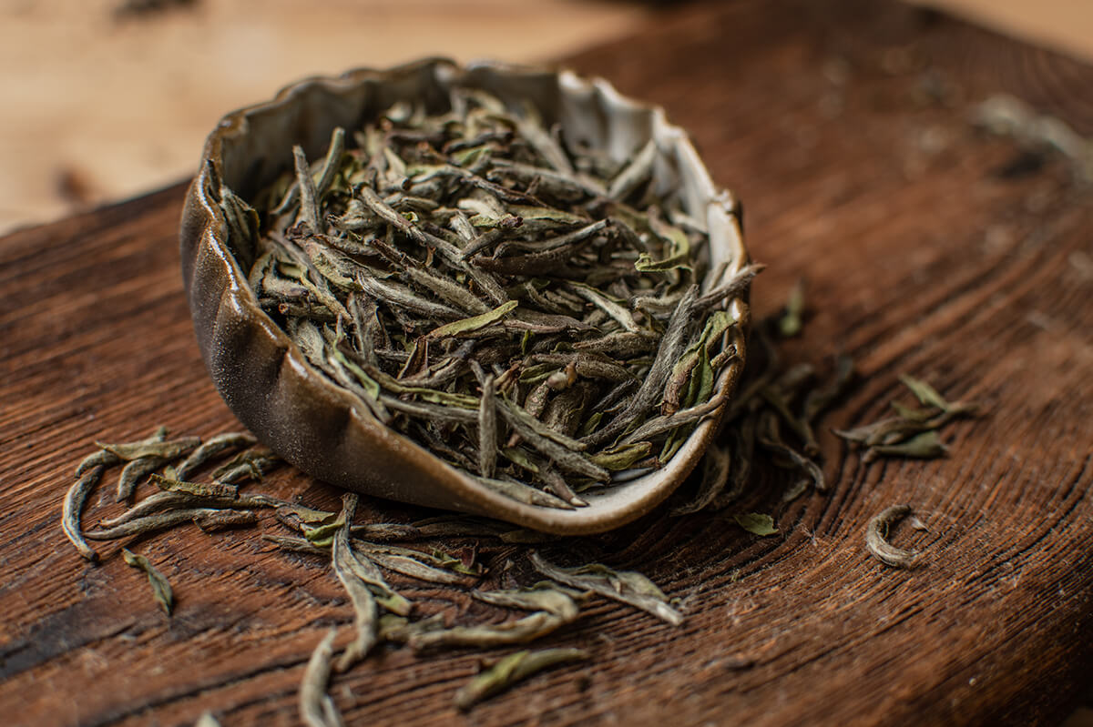Еще один образец выдержанного белого чая из Фудина. Почки оливкового, бежевого цвета, покрытые сероватым ворсом, и зеленые одиночные листочки.