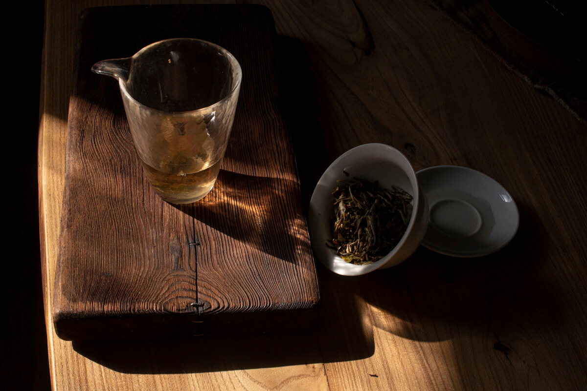 Слегка выдержанный, нежный белый чай, спрессованный в форму блина. Информация на обложке гласит, что это Бай Хао Инь Чжэнь, но по факту чай ближе к Бай Муданю, Белому Пиону. В основе сбора — почка с листом и почти раскрывшаяся почка.