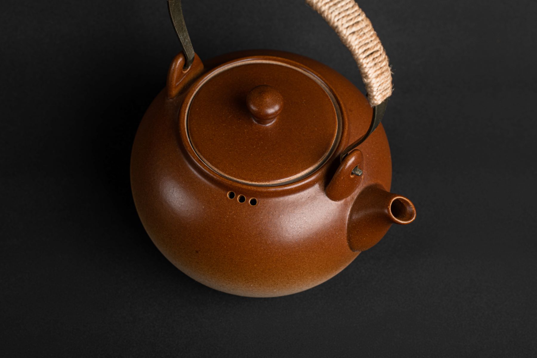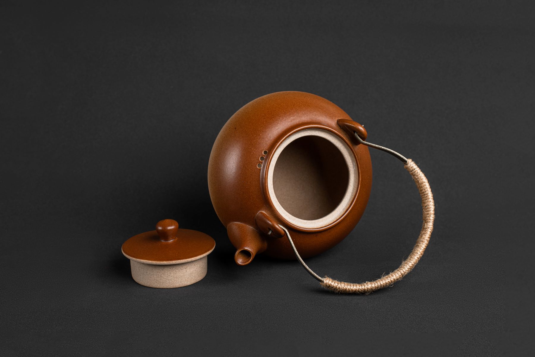 Чайник для кипячения воды из огнеупорной глины. Увесистый и толстостенный, с металлической ручкой.